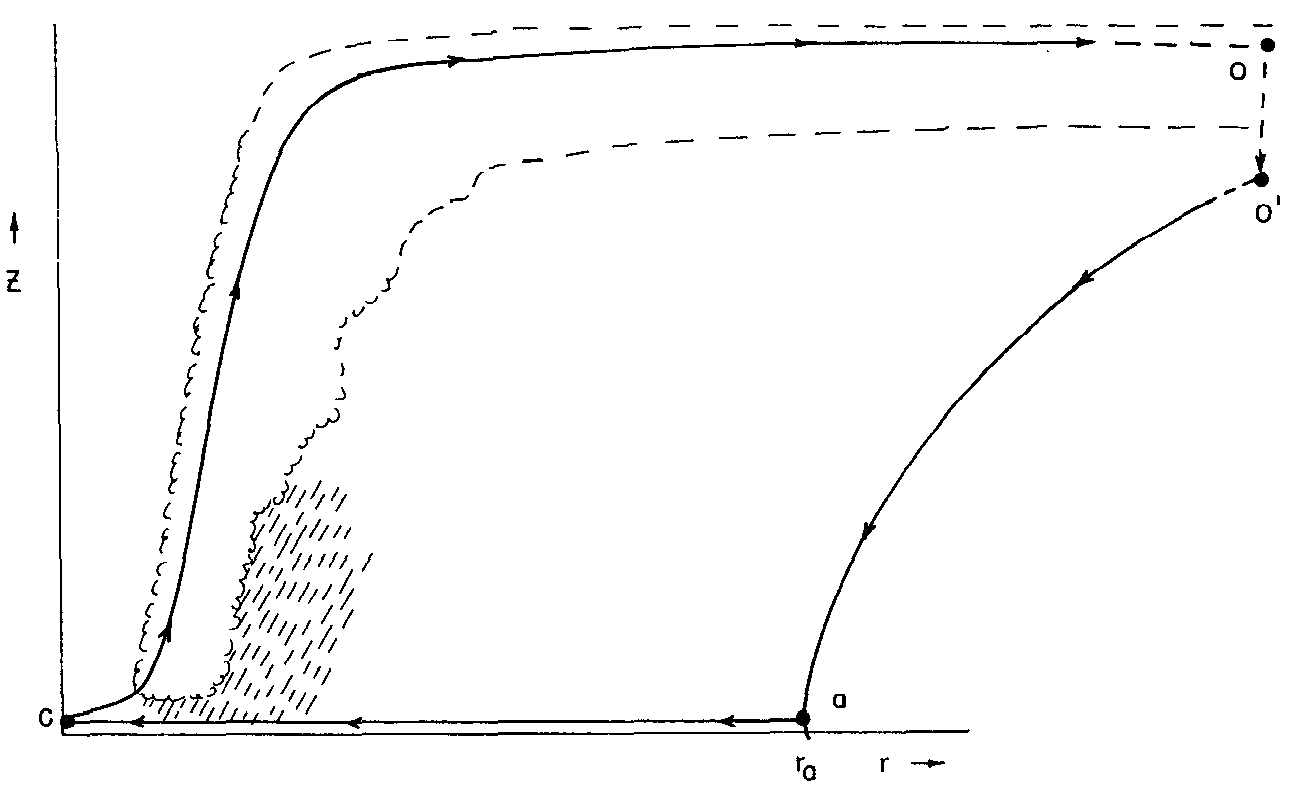 Air begins spiraling in toward the storm center at point a , acquiring entropy from the ocean surface at fixed temperature T. It then ascends adiabatically from point c, flowing out near the storm top to some large radius, denoted symbolically by point o. The excess entropy lost by export or by electromagnetic radiation  to space between o and o’ at a much lower temperature To. The cycle is closed by integrating along an absolute vortex line between o’ and a. The curves c-o and o’-a also represent surfaces of constant absolute angular momentum about the storm’s axis.